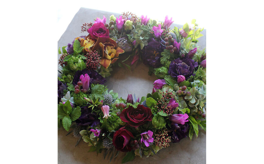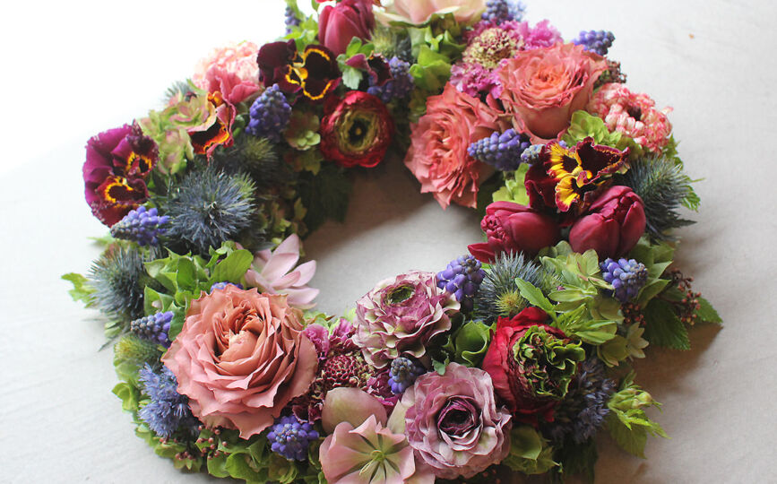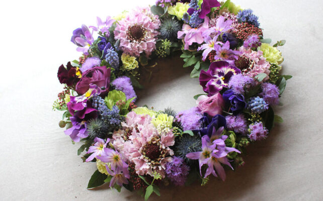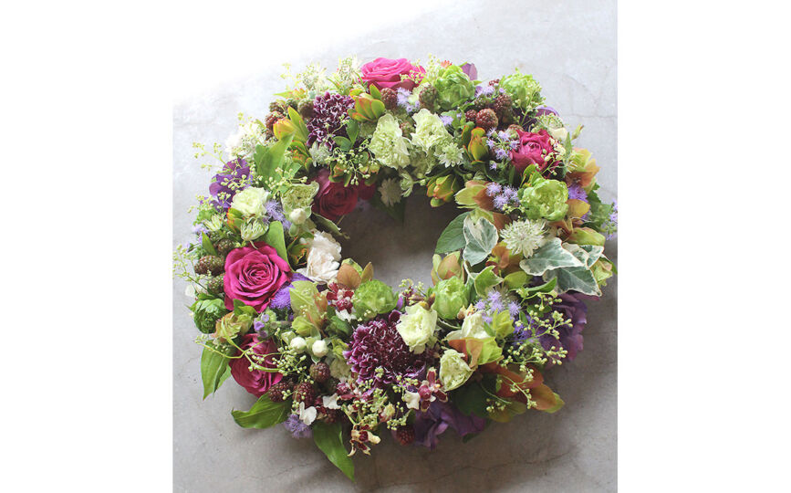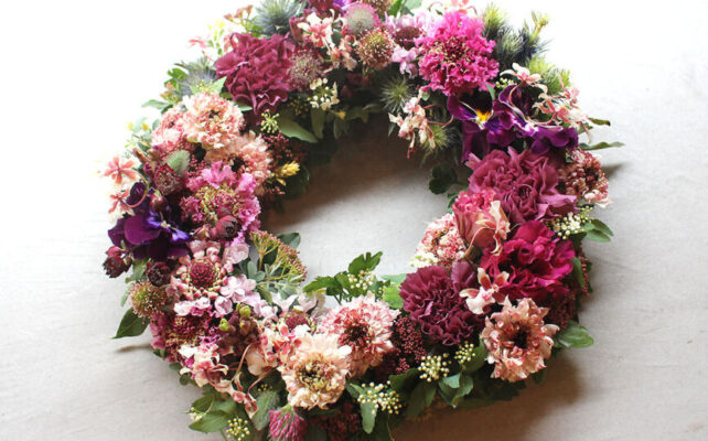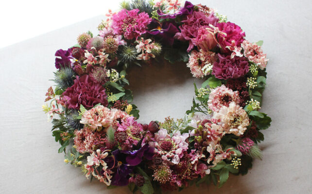 小花を豊富に使ったリースは、繊細で可憐な美しさを演出します。さまざまな種類の花を組み合わせることで、カラフルで鮮やかな色彩や多彩なテクスチャーがリースに生まれ、季節によって変化する花々の魅力を表現します。
