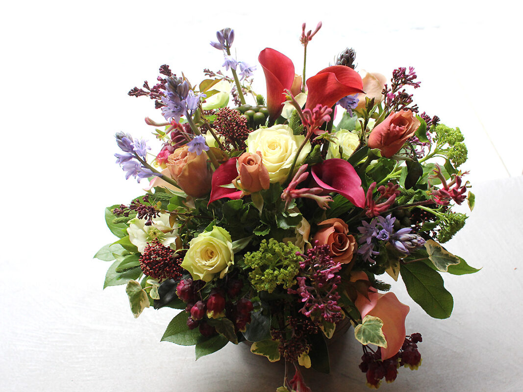 花々が自然に寄り添うように重なり合い、まあるく広がるフォルムが印象的なラウンドスタイルアレンジメントです。ふんわりとした立体感は、どこから眺めても美しく、ナチュラルな魅力と大人のエレガンスを兼ね備えています。色や種類を問わず、花本来の表情が引き立つよう丁寧に配置することで、柔らかい空気感と品のある佇まいを両立させました。