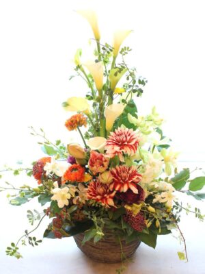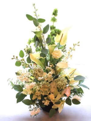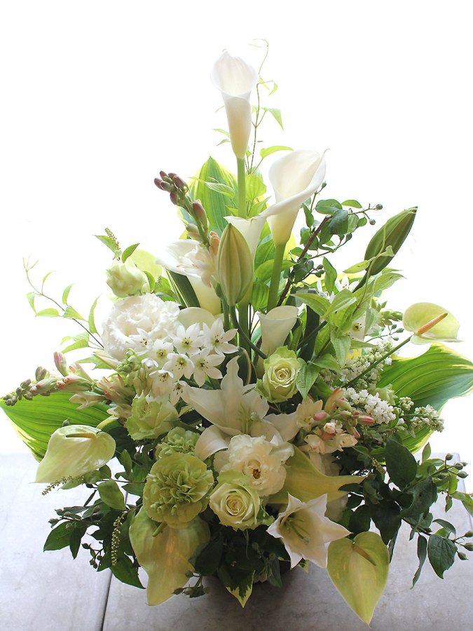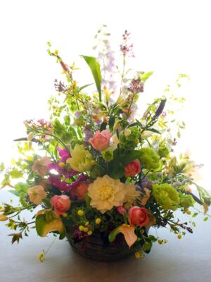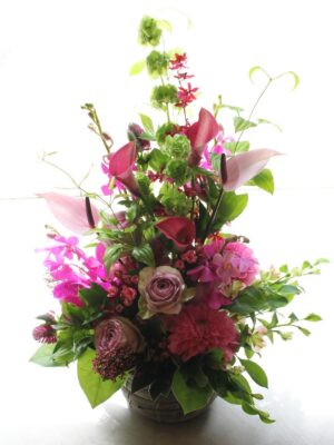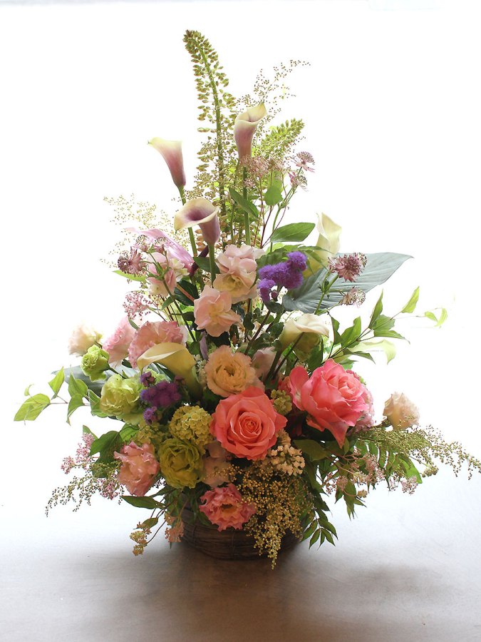 開店開業の御祝い、個展の御祝い、楽屋見舞いなど様々なお祝い事に贈られるスタイルです。また御仏前(御供)のアレンジメントとしても一般的なスタイルです。