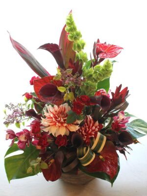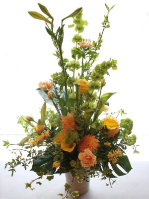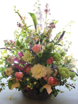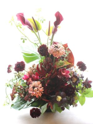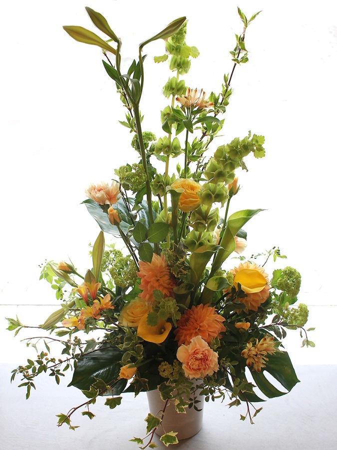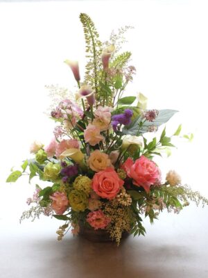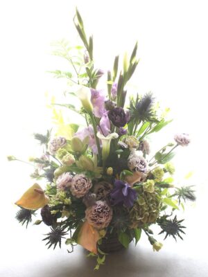背の高いオーソドックスな片面見のスタイルのフラワーアレンジメント。