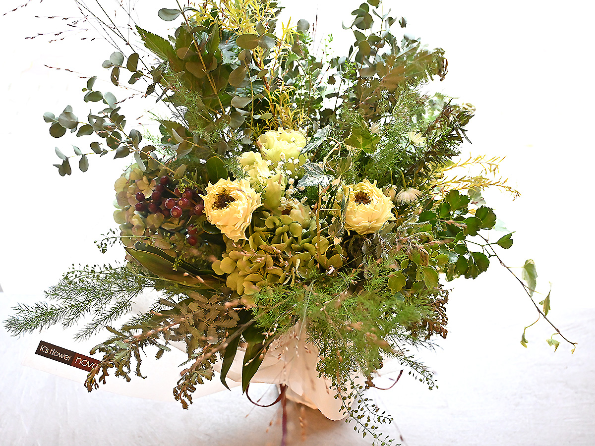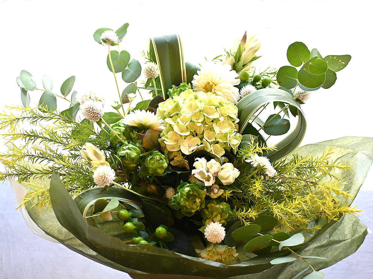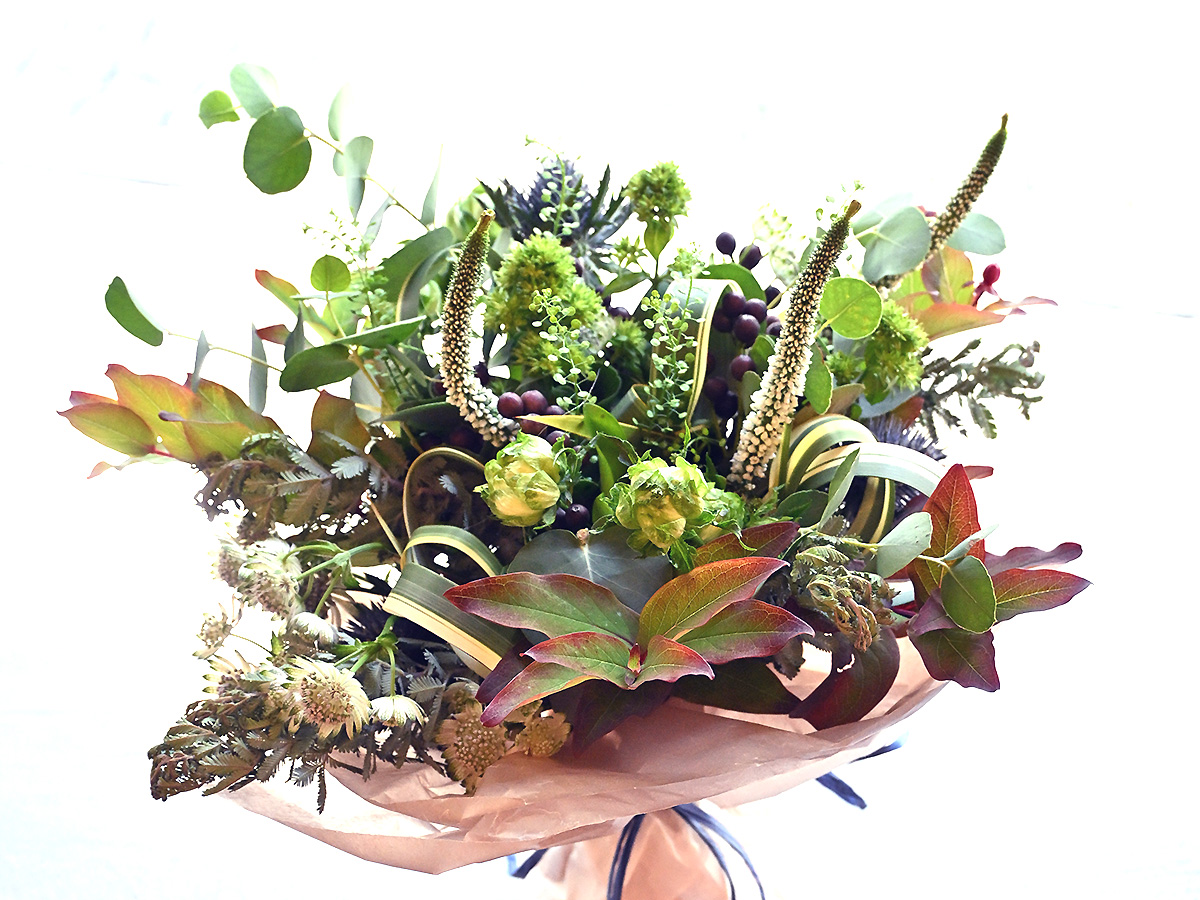 季節感や自然を楽しめるよう、その時期のお花や枝物・葉物を束ねます。たっぷりのグリーンに四季折々のお花を束ねるブーケは、なんでもない日の花束にピッタリ!