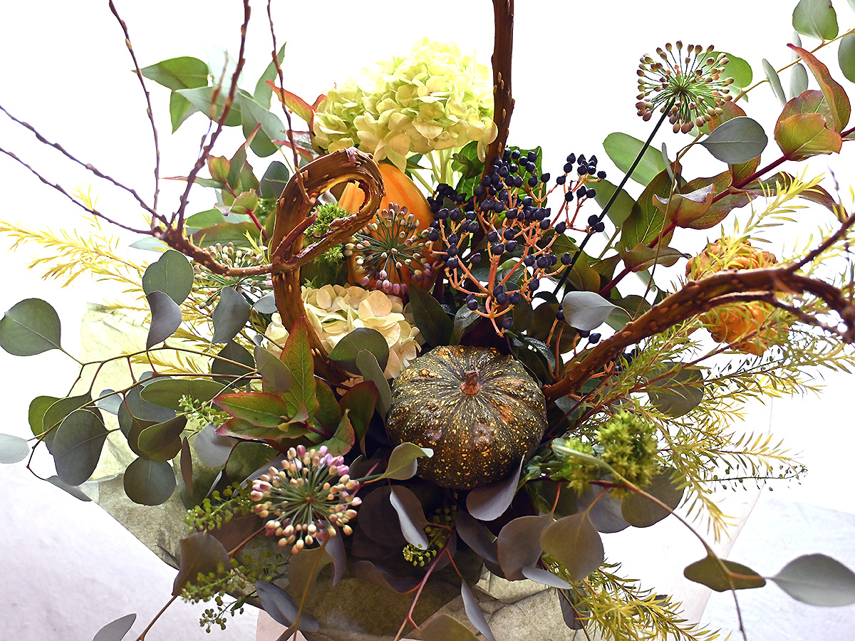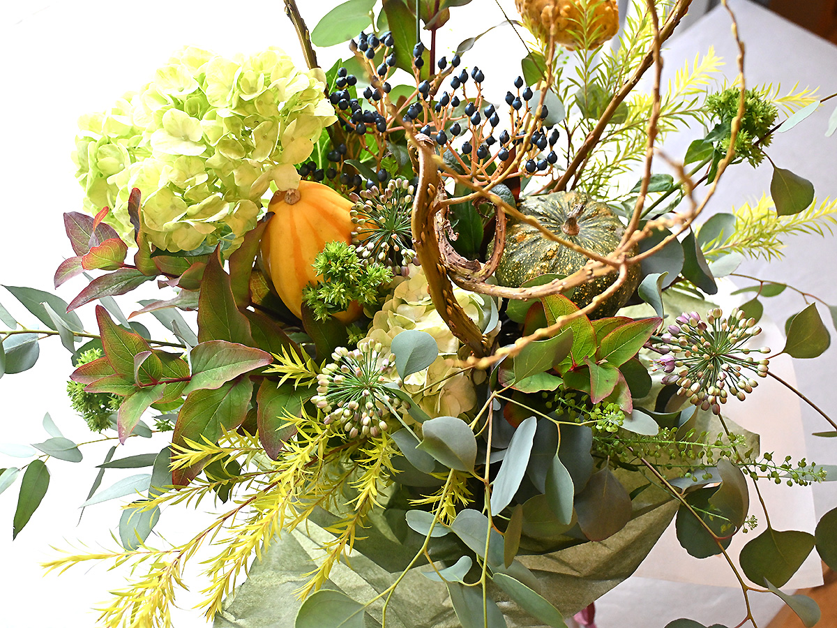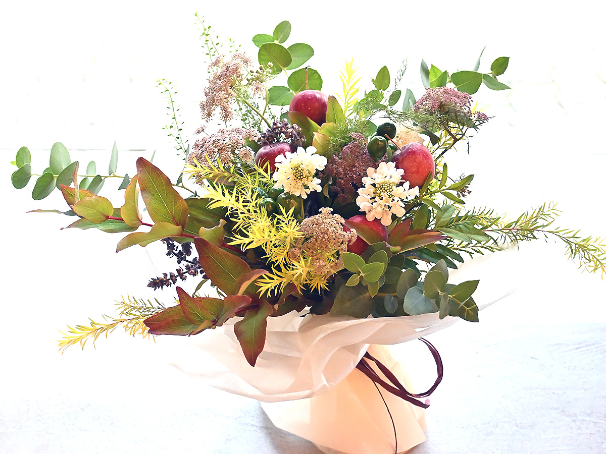 季節感や自然を楽しめるよう、その時期のお花や枝物・葉物を束ねます。たっぷりのグリーンに四季折々のお花を束ねるブーケは、なんでもない日の花束にピッタリ!