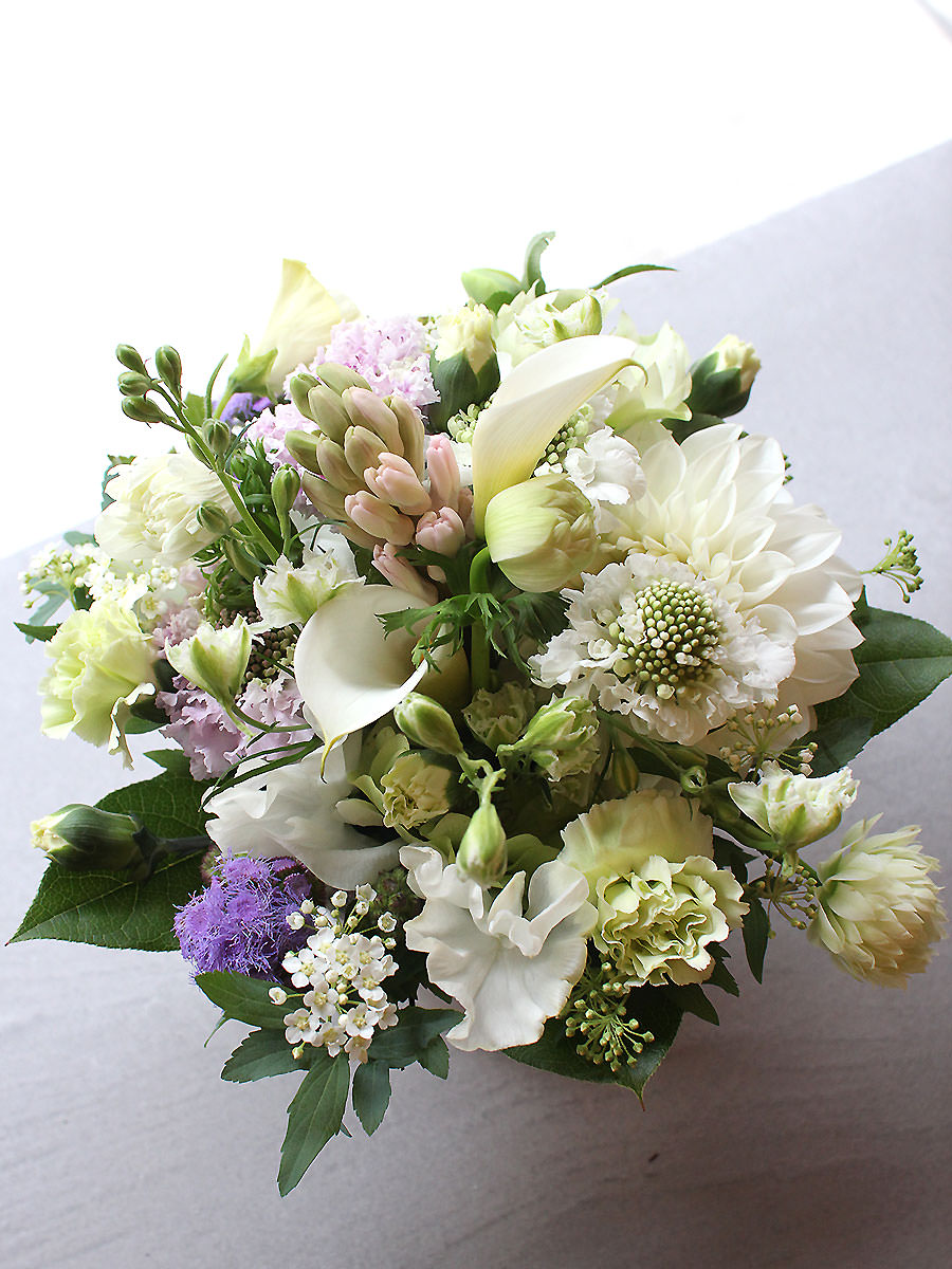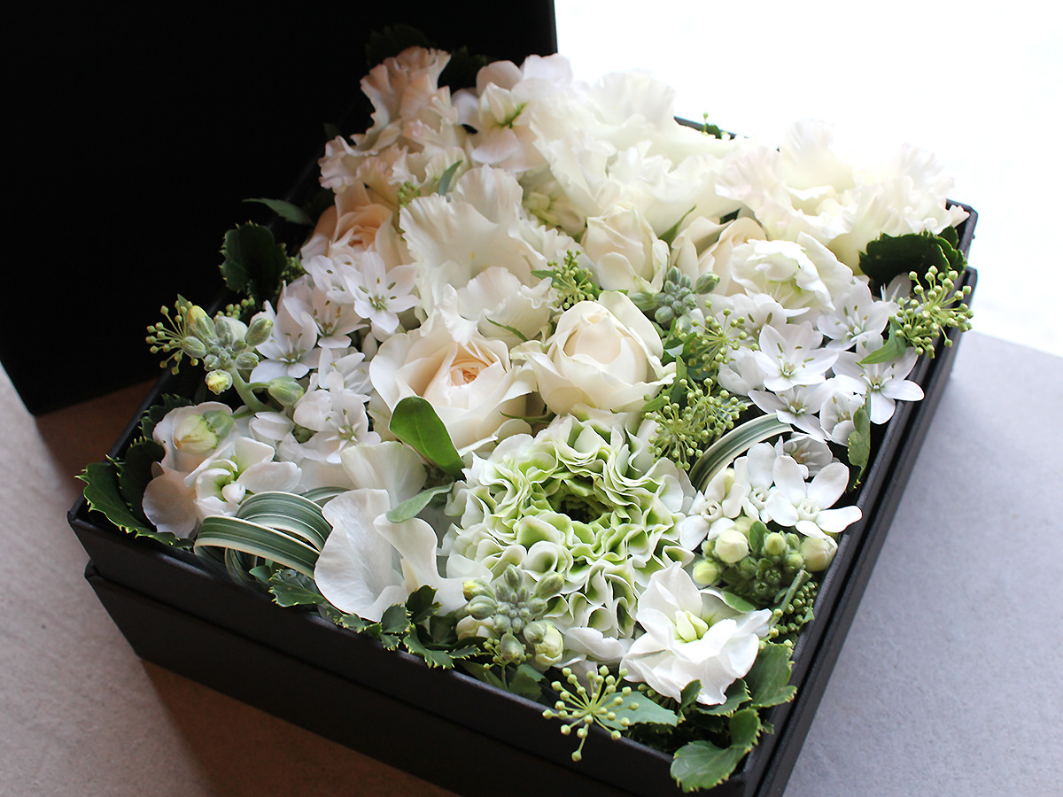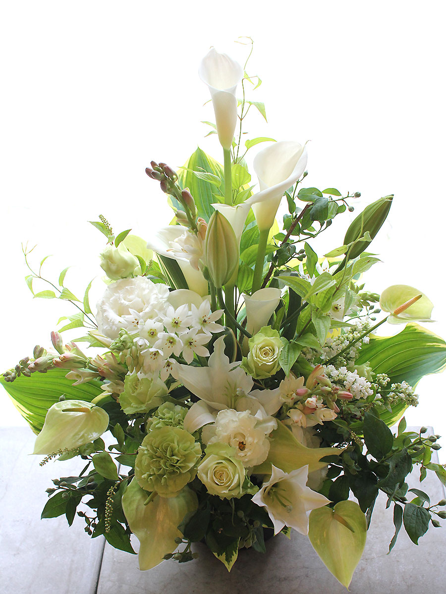 白や淡い色合いを中心にまとめた花々が、清らかでやさしい雰囲気をつくり、ご遺族の心をそっと癒します。ご自宅用はもちろん、葬儀・法要・命日など幅広いシーンに安心してお選びいただける上品なデザインに仕上げました。