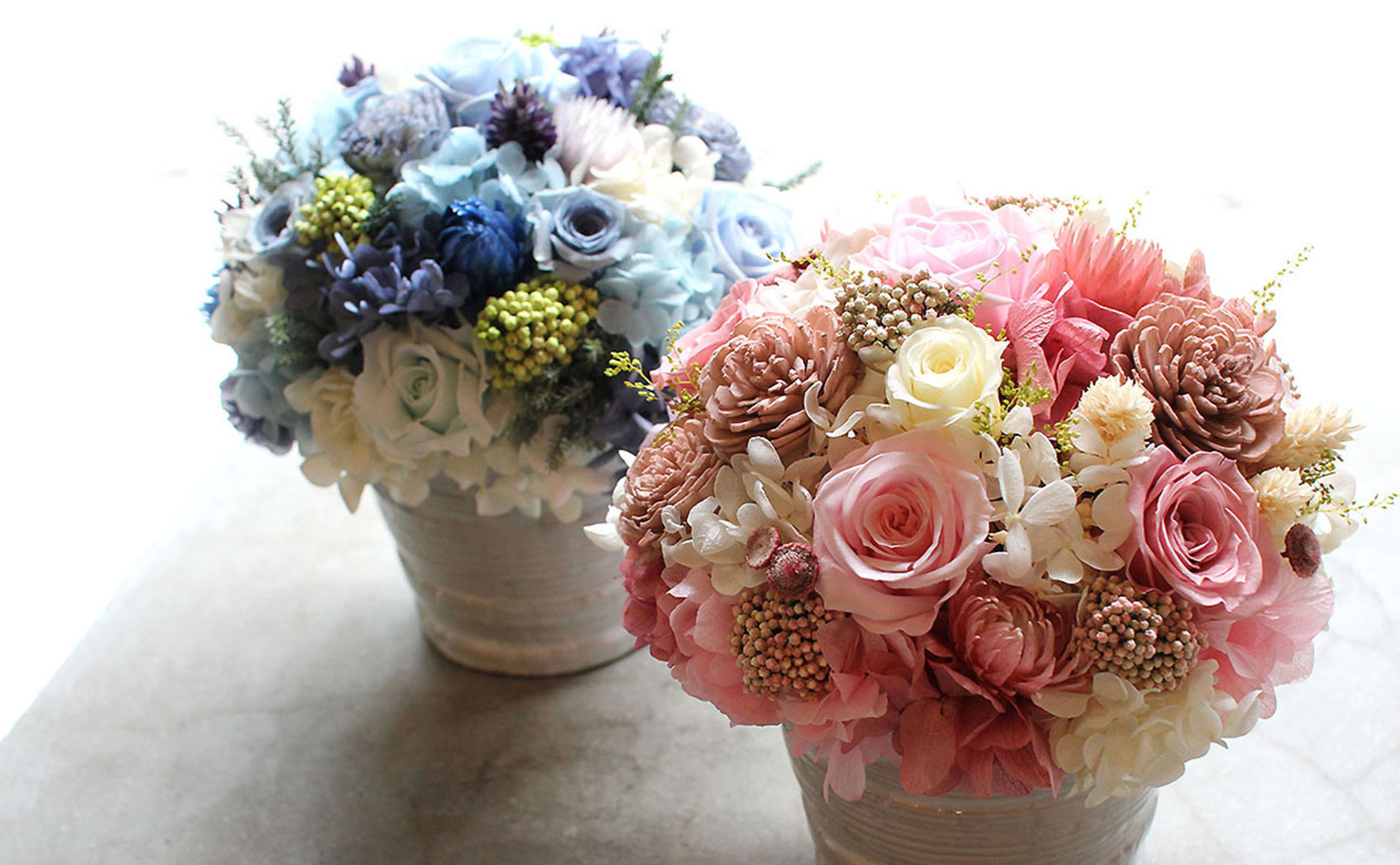 生花の瑞々しさをそのままに、長く咲き続ける特別なアレンジメントは、まさに“贈る芸術品”。