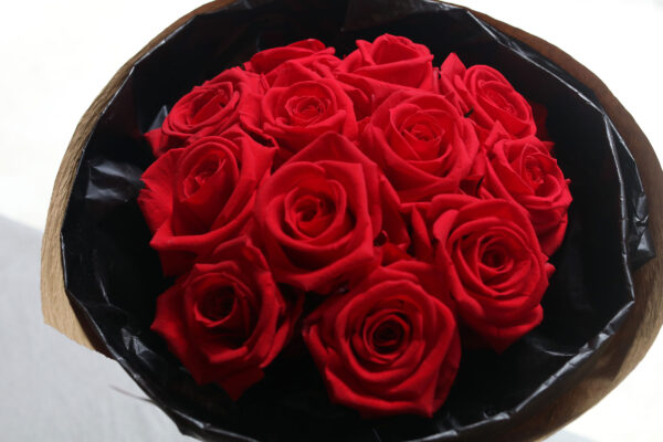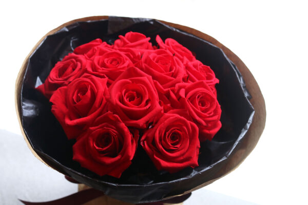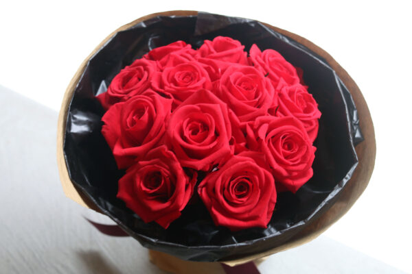 このブーケには、愛と感謝を象徴する12輪(ダーズンローズ)のプリザーブドフラワーを使用しています。生花のような瑞々しさを保ちながら、水やりの手間もなく、美しい姿を数年間にわたって保ち続けます。