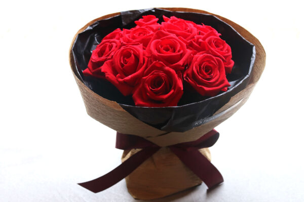 深みのある真紅のバラは、シックなブラックのフィルムと温かみのあるクラフト紙で丁寧に包み上げ、大人の女性にふさわしい高級感とエレガンスを演出。リボンには深いボルドーカラーを選び、全体を引き締めています。