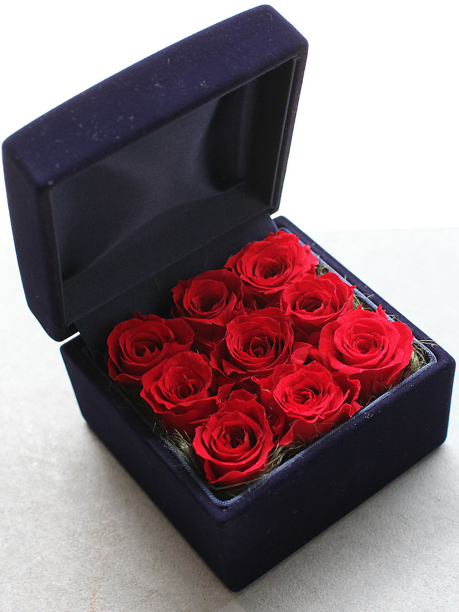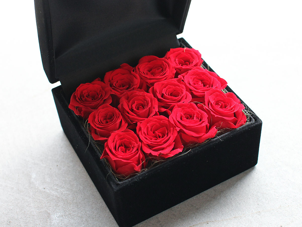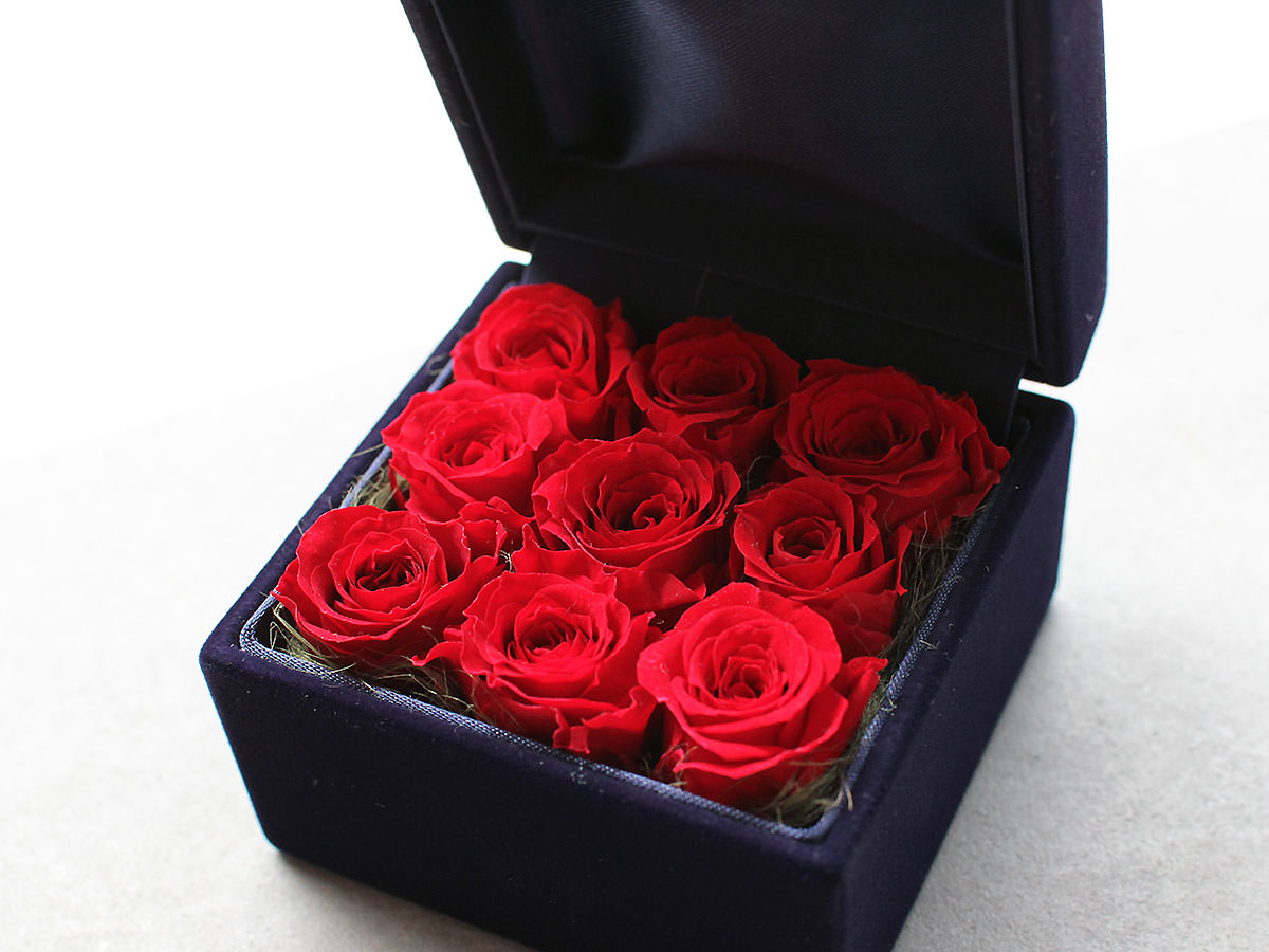 中には、厳選された大輪のローズを丁寧にプリザーブド加工し、鮮やかな赤色を保ったまま、贅沢に敷き詰めています。生花のようなみずみずしさを保ちながら、水やり不要で数年にわたって美しさが持続するため、特別な日の記念を「枯れない愛の証」として残すことができます。