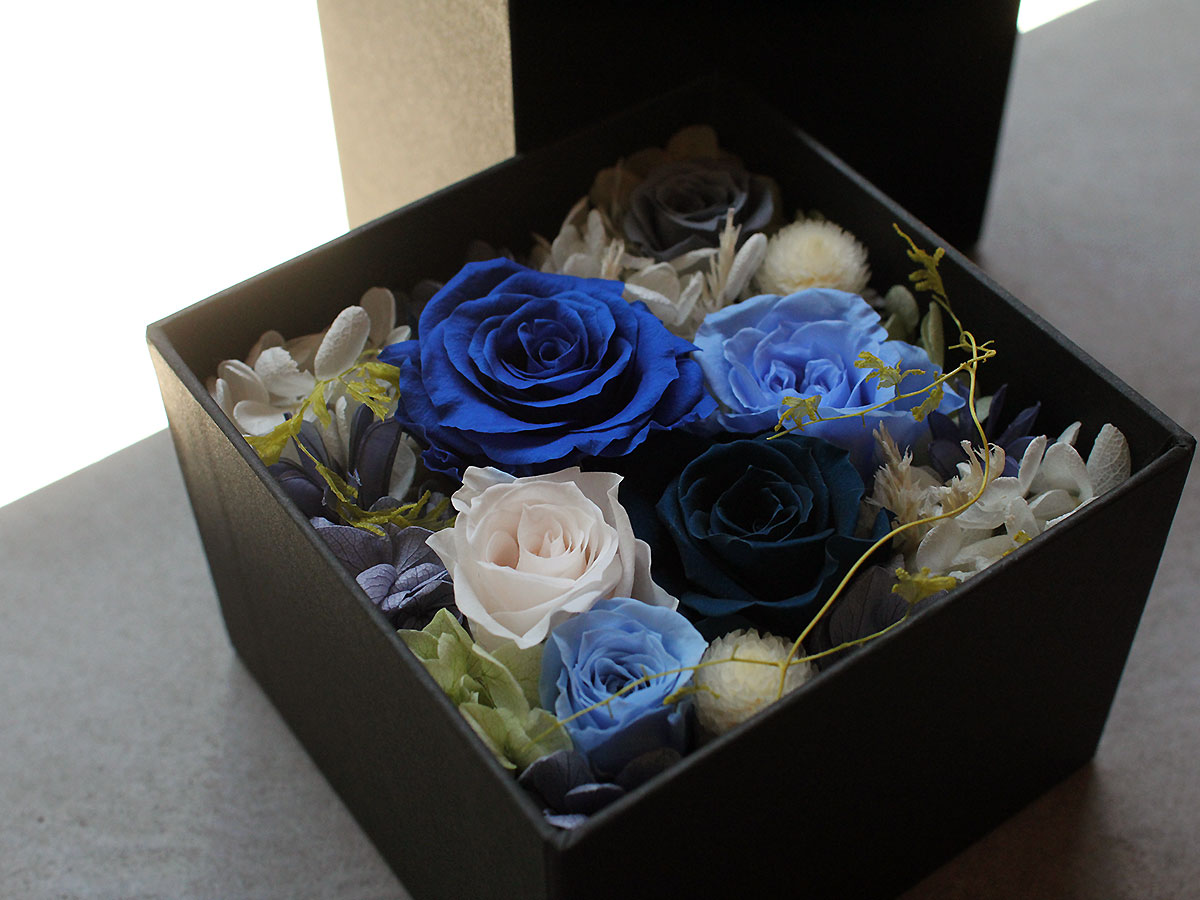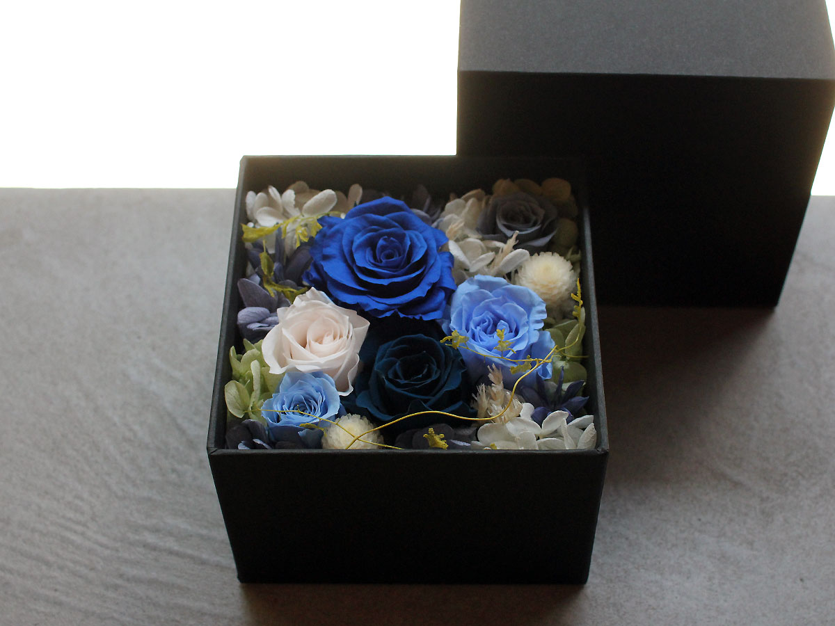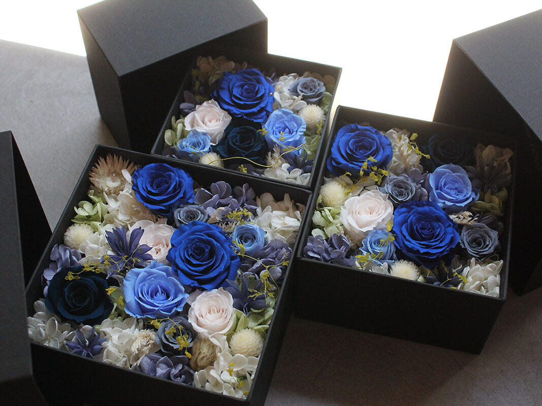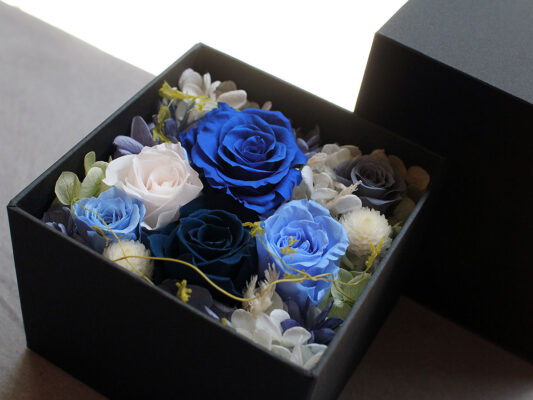 ジュエリーケースを思わせる重厚なマットブラックのボックスは、夜の静寂を思わせるキャンバス。その中に、主役である濃紺からインディゴブルー、そしてスカイブルーへと変化する、神秘的な青のプリザーブドローズを贅沢に咲かせました。