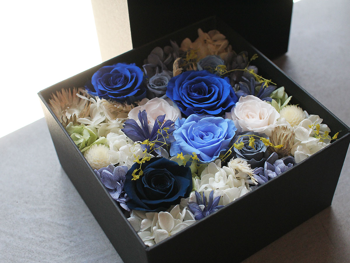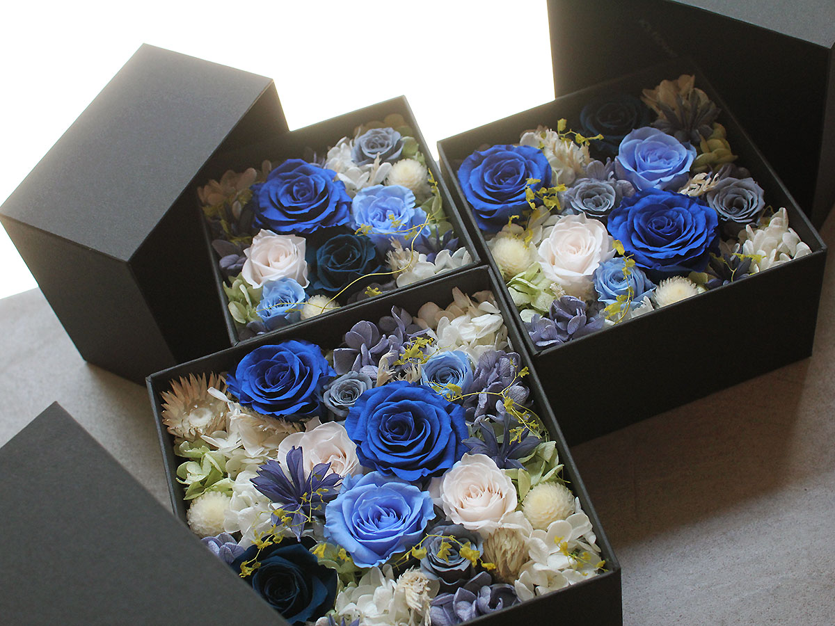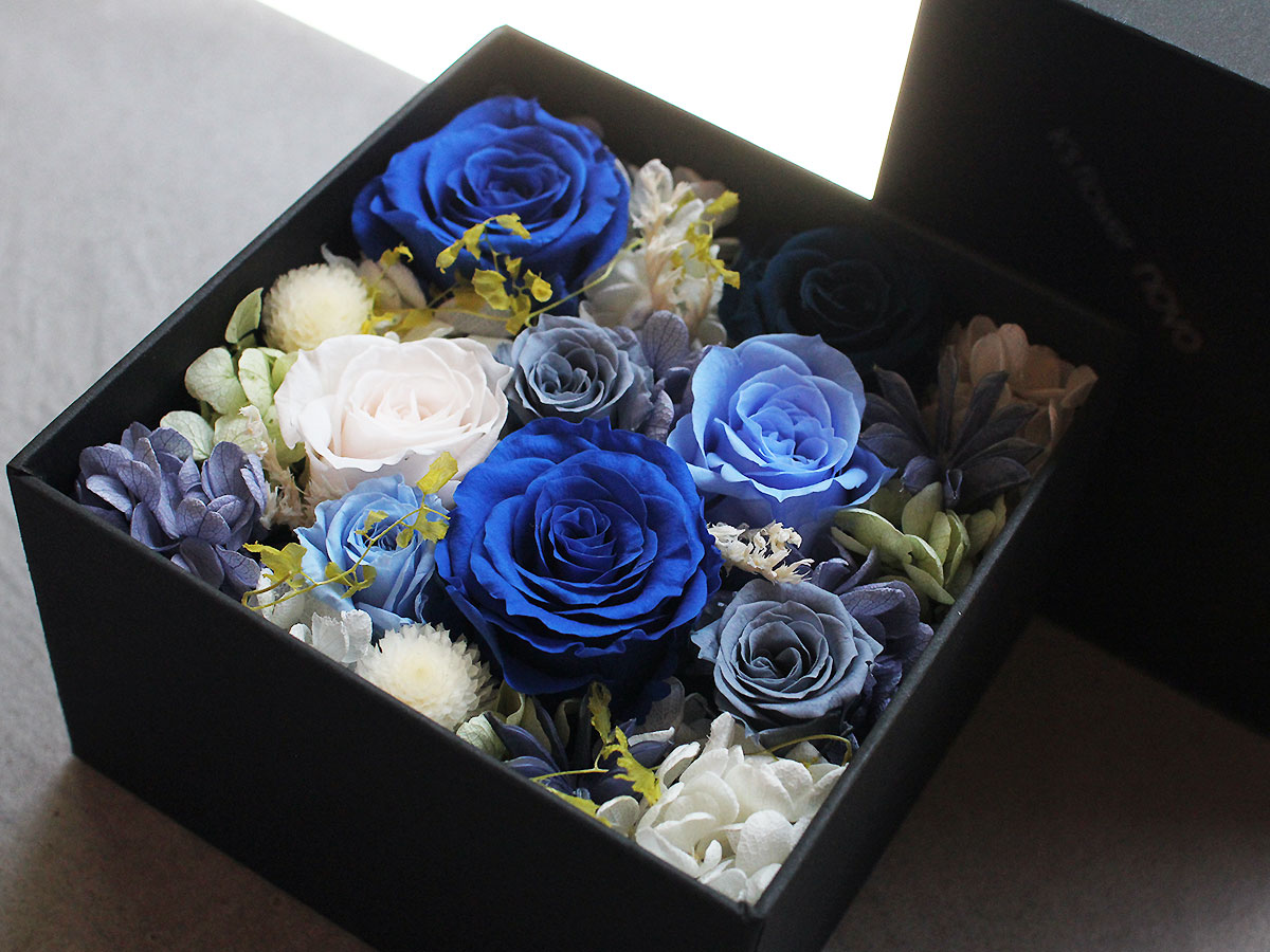 ジュエリーケースを思わせる重厚なマットブラックのボックスは、夜の静寂を思わせるキャンバス。その中に、主役である濃紺からインディゴブルー、そしてスカイブルーへと変化する、神秘的な青のプリザーブドローズを贅沢に咲かせました。