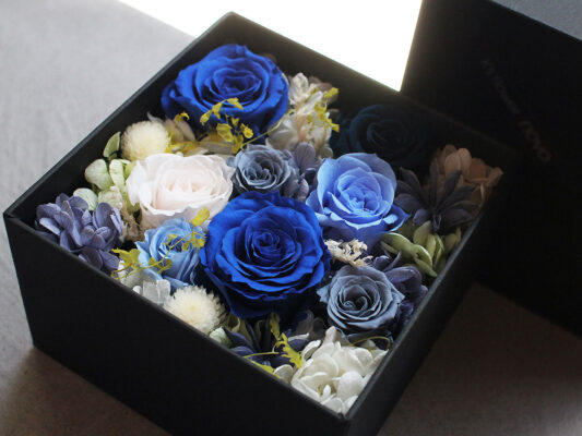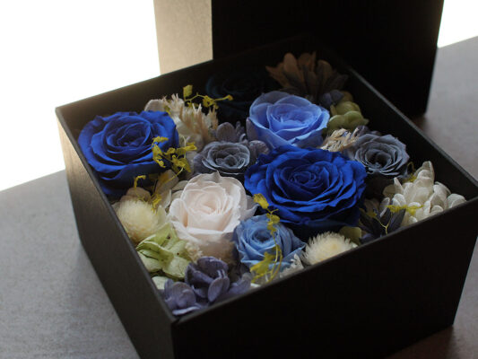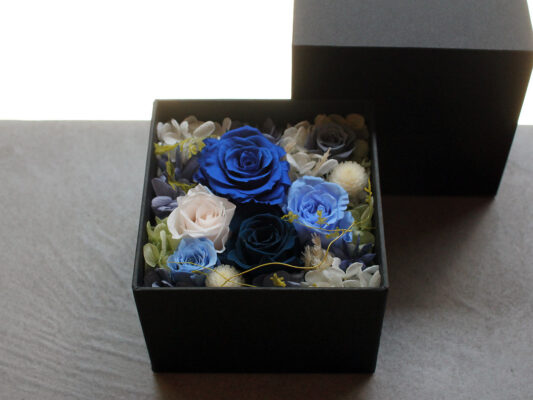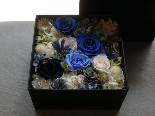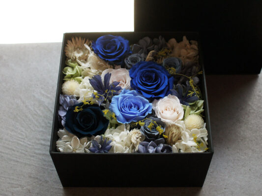 夜空に咲く、青い奇跡。大人の心を満たす、シックなフラワーボックス「Azure Nocturne(アズール ノクターン)」。この上なくシックでエレガントなフラワーボックスアレンジメント。