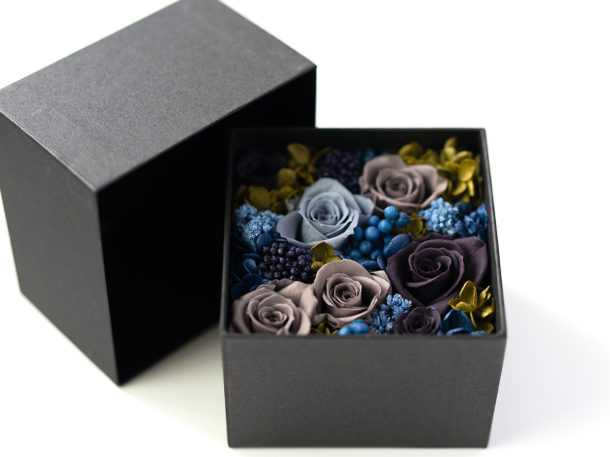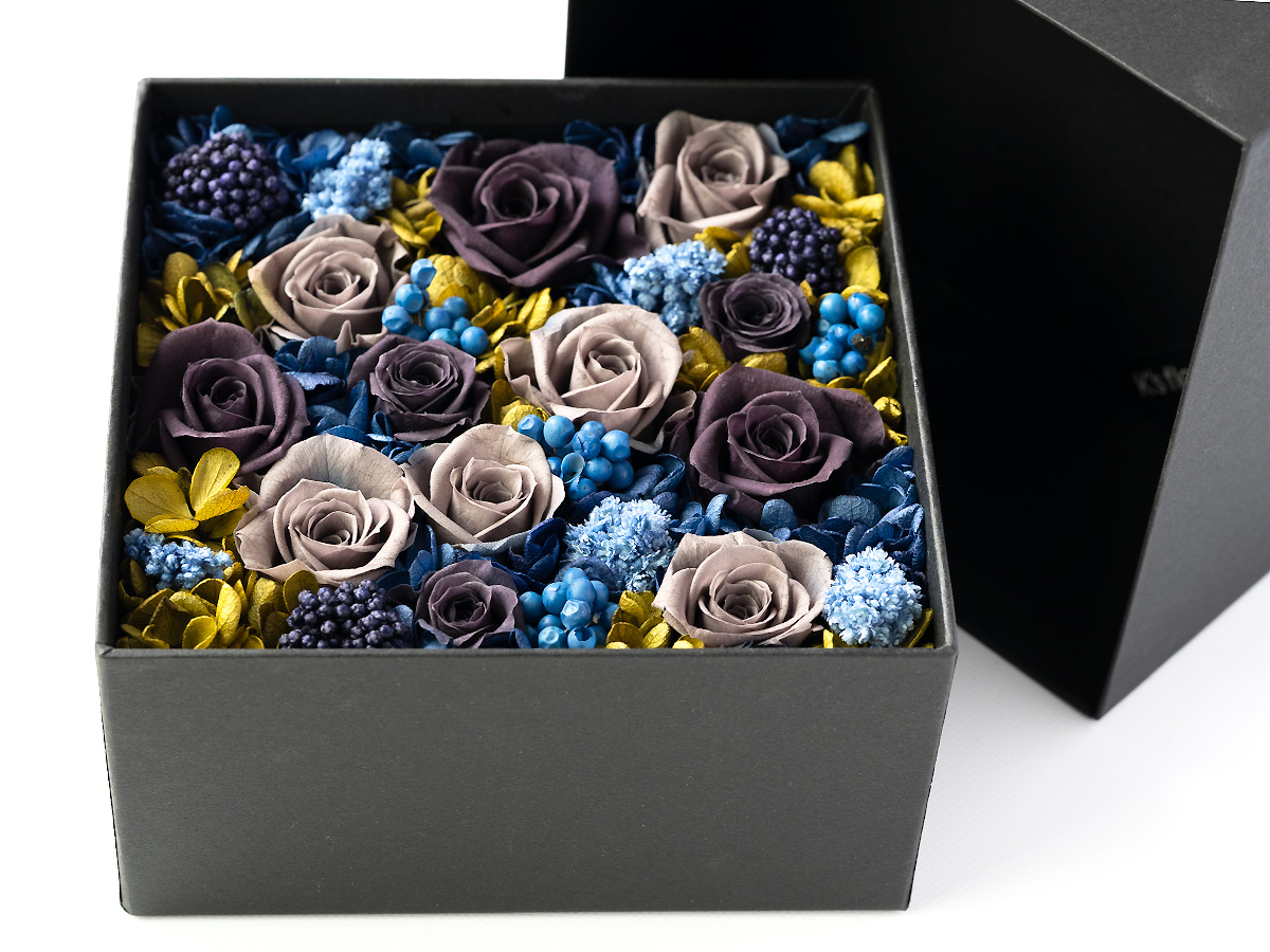 深みのある色彩が静かに語りかけるヴィンテージカラーのプリザーブドフラワーボックスアレンジメント。